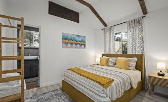 The main bedroom is designed for rest and relaxation, featuring a queen bed with luxurious linens and soft mountain décor.