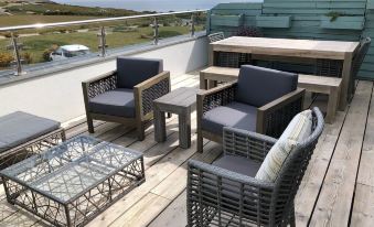 Opening out from the lounge is a large roof terrace with outdoor dining table and chairs for eight to ten people. There is also a smaller balcony overlooking Burgh Island. A separate large patio area offers dining as the sun sets over the sea, with seating for eight to ten people.