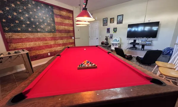 The games room featuring pool table, foosball, basketball hoop, playstation and smart tv make this a perfect destination for kids of all ages to entertain themselves.