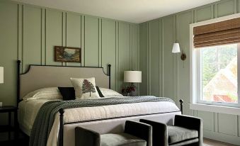 * The third bedroom on the main floor boasts a king bed, and smart TV. It is supported by a full bath just outside the bedroom door with walk in tile shower