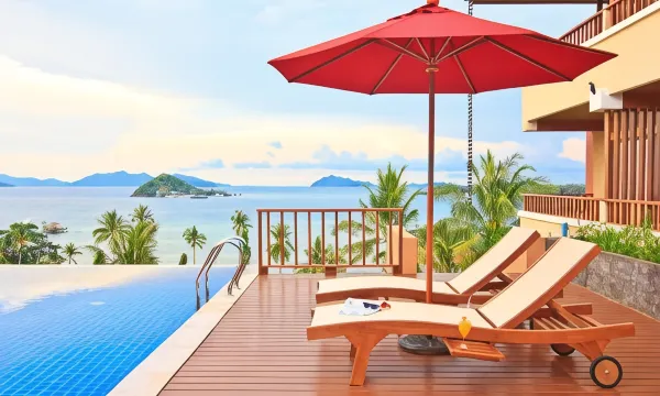Отель расположен на возвышенности, пляжа нет. В ближайшем отеле Cococape вход на территорию с уютным баром на пирсе стоит 200 Батт с человека. Если останавливаться здесь - берите в аренду байк (200-300 Батт/ день) или гольфкар (1000 Батт/ день), чтобы покататься по разным пляжам и поужинать. Еда в ресторане отеля вкусная, но цена завышена.