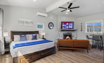 Bringing the whole crew? We've got you covered with an attached studio suite that feels like its own mini home. Enjoy complete privacy from the rest of the group with a king bed, fireplace, Smart TV, dining area, deluxe kitchenette, full bath, and a private entrance. It even has its own sliding door out to the backyard-ideal for someone wanting a little extra space.