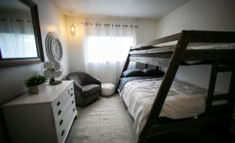 1)The main bedroom upstairs has a Queen-sized bed with a hybrid memory foam mattress for the ultimate nights sleep and a small private bathroom with a shower. 2) There is a bunk bed with a full-size mattress and single mattress across the hall. 3) The smallest bedroom has a single trundle bed that can convert into a king-size that fills the room. The lower "sunken" den/family room has a home theater big comfy couch, a recliner chair, and a walkout to the backyard.