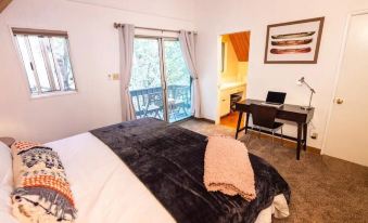 Upstairs the master bedroom offers vaulted ceilings, a private deck, walk-in closet and an ensuite bathroom with a shower. A small desk is perfect for catching up on emails. This makes it an ideal area to find some peace and privacy.