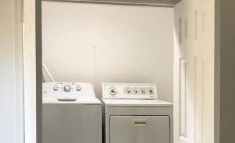The level below is where you'll find the fun-filled game room, which includes a full size foosball table, retro arcade, TV and more -- a wonderful space for families with kids to hang out. And if you need to do laundry, a washer and dryer are located inside behind closed doors. This level is accessed by outdoor stairs which connect the upper and lower decks.
