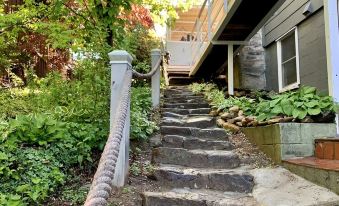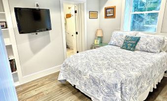 The master bedroom is equipped with a king size bed as well as a gorgeous private master bath. After a long day of playing in the sun, come in and stand under the rain shower in the master bath. The additional bedroom on the main living floor has the original hardwood floors from the 40’s and boast a comfy king size bed. The private bathroom will not disappoint, it has a large soaker tub plus a rain shower.