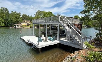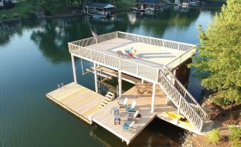 The deep water cove (15+ feet at full pond) has a spacious dock with upper lounge deck all accessible from the house via a lighted paver walkway. Swimming and floating is ideal with the clear calm water in the family friendly cove. Relax on the Adirondack chairs in the sun or move to the covered area with a table and chairs. Boat house includes use of refrigerator, SUP and kayak. Life jackets available. (Use all at your own risk)