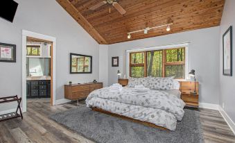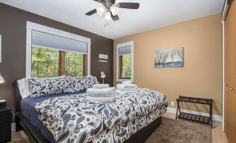 Four beautiful themed bedrooms await you. The upstairs bedrooms have high definition televisions with free Xfinity Cable--just in case you need some quiet time away from friends and family. All four bedrooms have top quality king mattresses and WIRELESS PHONE CHARGERS on each night stand. The master bedroom (the HOLLAND room) has an en-suite with double sink and large rainfall shower with high windows and skylights. All shades in the master bedroom are controlled by remote controls. The MACATAWA and SAUGATUCK rooms have beautiful windows and furnishings. A full bathroom lies between these two bedrooms. The WOODLAND room in the den/ basement has a beautiful view of the surrounding woods. The bonus room has a twin over twin bunk bed. Another full bathroom is located between WOODLAND and the bonus room. Finally, 2 portable memory foam twin mattresses with linens are available if needed.