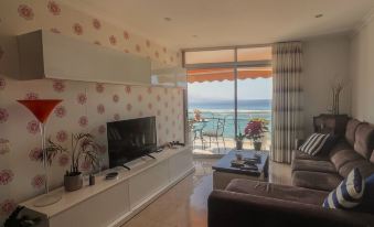 The living and dining room is full of natural light and offers direct access to a private balcony with sea views. It includes a sofa, dining table, Smart TV and large windows that make the space feel fresh and open.
