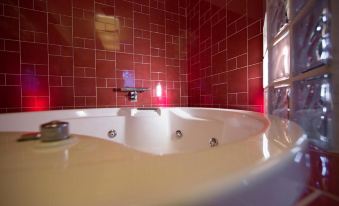 Le uniche cose belle sono la tv dentro lo specchio e la vasca idromassaggio, che comunque non ha una scaletta per accedervi. Il lavandino del bagno scomodo è non ci sono cassetti o armadi per riporre i vestiti. La struttura del letto vecchia e scricchiolante.Bagno separato dalla camera solo con una tenda rossa pesante che non da privacy. Buffet della colazione nella norma ma le bevande calde non sono espresse ma c'e' una macchinetta automatica. Dalla descrizione la stanza sembrava piu' lussuosa, bella l'idea delle camere a tema ma poco curate. Prezzo un po' alto