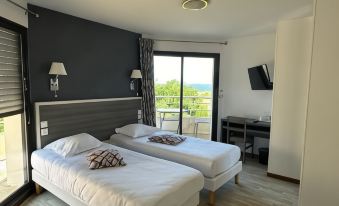 Un hôtel deux étoiles qui demande une vrai cure de rajeunissement. Au delà de la chambre petite , un mobilier défraîchi, une salle de bain figé dans le temps ...rafistolage au Scotch noir pour habiller la tablette , une porte de sdb en accordéon bruyante et inesthétique , un radiateur collector. .même si en août on ne en sert pas ...une literie très bof...et une insonorisation insuffisante..on entend ce qui se passe dans les chambres voisines... Le plus L emplacement La vue sur mer superbe avec accès à une terasse mitoyenne (meme si bruyante car passage incessant des vehicules en cette période) Ĺ accueil des propriétaires très sympa . Un petit déjeuner plutôt bon avec la encore un bel environnement grâce à la vue dégagée sur la côte sauvage. Vraiment dommage ...car un peu de déco au goût du jour et du soin apporté aux finition pourraient en faire un bel établissement. En tout cas la chambre numéro 1 que nous avons eue ne justifiait pas 95 euros même en pleine saison.