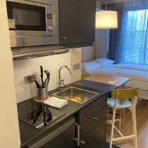 Risposta dalla struttura: Dear Lissi,We truly appreciate you taking the time to share your experience with us.We are pleased that you had an enjoyable experience at our aparthotel.The pristine condition of our premises clearly made a positive impression during your stay.While we note your observation about room service, our aparthotel concept focuses on providing independence through well-equipped kitchenettes.Lastly, we appreciate your positive remarks about our convenient location near public transport links.We look forward to welcoming you back for another pleasant stay.Best regards,Adagio Access Stuttgart Team