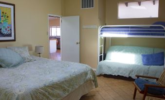 The rooms are spacious and the furnishings are comfortable, generous and tasteful. The master bedroom sleeps up to five, with one king size bed, and one bunk with full on bottom and twin on top. The second bedroom sleeps up to four with a queen size bed, and two twin size beds.