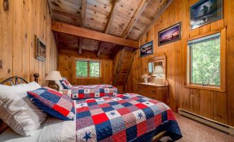 Our log home was built in 1984 with hand-hewn logs from the surrounding woods. As you enter the home with beams and walls covered in wood from an 1820's barn you begin to feel the stresses of everyday life melt away. The soaring 24 ft cathedral ceiling and grand stone fireplace welcome you into the family/dining area and the adjacent wall of windows looks out at the surrounding wilderness where deer, raccoons, squirrels and birds can be viewed from the comfort of the home. We have installed new ductless A/C in the main room on the first floor in 2022 for your comfort. New carpeting has been installed throughout the cabin in June 2024.