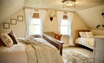 This charming home offers 3 full baths, 2 bedrooms on the main floor, a loft with three additional single beds, and a beautiful master suite on the second floor with original cordwood walls and a gas fireplace. In addition to the farmhouse, the granary building located in the back yard is set up as its own private suite with a queen bed and sitting area. We are cleaning per CDC guidelines and following disinfecting procedures to make sure we provide a safe, comfortable and clean environment for you. We look forward to hosting your stay!