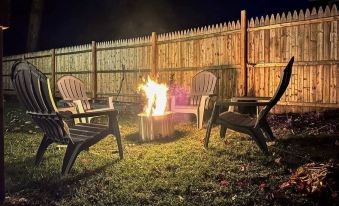 For most, the highlight of this vacation rental is the private backyard, where you can truly unwind from your daily grind. Step onto the patio and be greeted by the warm glow of bistro lighting, creating an enchanting ambiance for evening gatherings. Sink into the bubbling hot tub and let your worries melt away or gather around the fire pit for cozy conversations and marshmallow roasting. Ample seating and lounging areas also make for a perfect space to enjoy your morning coffee or to savor a meal al fresco. Whether you're sunbathing on a summer afternoon or snuggling up with blankets by the fire, this private space will surely be a favorite spot during your stay.