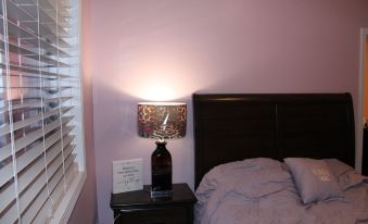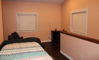 The bedroom is furnished with a queen-size bed and dresser. The open area has a twin-size bed with trundle, tall dresser, night stand and a queen-size air mattress.