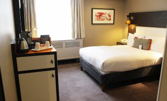 Room is small but more spacious than other London hotels we've stayed at before, there's just enough space to fully open one large suitcase. Overall tidy and clean. Air conditioning works well. The desk is suitable for working at. Nice view out of the window. Selection of tea and coffee provided with a coffee machine and separate kettle.