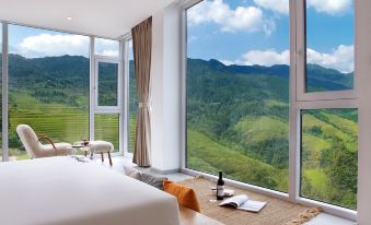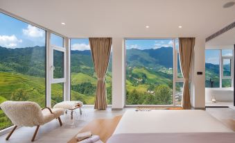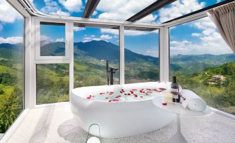 The hotel is located at the side of the observation platform No. 2 of Tiantou Village, Dazhai Village, Longji Terrace. Each room faces the mountains at sunrise and lies on the bed to watch the sea of clouds at sunrise. Each guest room is equipped with a panoramic French window, a viewing bathtub, a multi-function thermostatic wine cabinet, an intelligent toilet, and some guest rooms also provide projectors, washing machines, rotating stairs, etc. to provide you with high-end and comfortable travel and vacation life. The hotel is grand and magnificent. There are independent viewing platforms, gyms, and bars here, where you can watch the mountains and fields, watch the changes, and also indulge in the mountains and embrace nature.