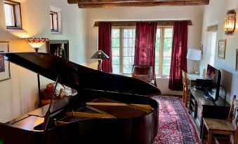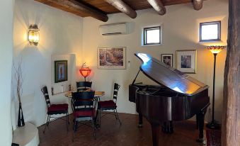 The casita offers a true New Mexican Adobe experience with modern amenities. We've outfitted the kitchen with all the things needed to prepare a quick breakfast, as well as a full dinner. Enjoy high speed WiFi and AppleTV in the living room for relaxing or cozy up to the 100 year old baby grand piano!