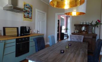 Next to the kitchenette is a large, nostalgic wooden table. Above him are two beautiful lamps that conjure up golden light at the dining table. 6 upholstered high-back chairs provide comfort. An antique sideboard filled with nostalgic dishes offers plenty of storage space. The kitchen-living room has a small balcony with a wonderful view over the roofs.
