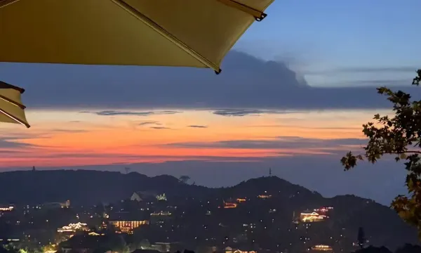 傍晚時分,夕陽西下,天邊被染成金紅色,餘暉灑在山巒上,與周圍的雲霧、山林相互映襯,形成一幅絢麗多彩的畫卷。尤其是在晴天,晚霞如披上萬丈霞光織就的錦緞,橙紅、粉紫等色彩交織在一起,將天空渲染得如夢如幻,讓人彷彿置身於仙境之中。