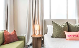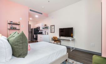 Welcome to this Cher inspired space. A vibrant corner studio that embraces bold design and confident color. With pops of pink and full-length windows on two sides, this unit brings in the light and lets you settle in with style.