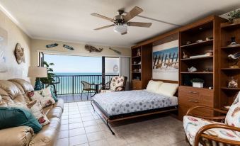 Our personal cozy, studio second "home", has been FULLY UPDATED and meticulously maintained with CLEANLINESS and ORGANIZATION as our highest priorities. Comfortable living amenities include high-quality rattan furniture, a comfortable full QUEEN-SIZED bed with full thickness mattress (11")(not a fold-out), a fully equipped kitchen, and a spacious balcony for an open-air refreshment as you overlook the white sand beach of the Gulf of Mexico. Work-friendly amenities include a desk and high-speed Wi-Fi for "Remote Work from Home" activities. Outside recreation amenities include a large heated pool and hot tub, charcoal grill, tiki hut with bar, and a shuffleboard court. A reserved, covered parking space under the building protects you from the elements when walking to and from the main building.