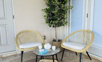 Step into the backyard and you'll find a variety of options for outdoor enjoyment. There is a dining table and a coffee table, both suitable for 4 people, where you can enjoy meals or simply soak up the sun. Underneath the shade of a mango tree, there is another dinner table that can accommodate up to 6 people, along with bar chairs and a bench. This area is perfect for taking pictures and creating lasting memories. In the mornings, you might even catch a glimpse of dolphins, sea pigs, or crabs fishing in the water.