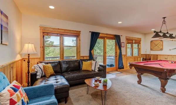 Come on down to play in the wolves’ den. Enjoy a card game or favorite board games with family or friends on our oversize comfy couch with a chaise or on the reclining chair, or you can challenge yourselves to a game of pool or darts. You might also cozy up with a good book beside the stone gas log fireplace. Mix up a cocktail or grab a cold beer from our bar area and sit back in one of our cushy bar chairs or enjoy popcorn and a movie (microwave and mini-fridge provided). Enjoy a dip in the hot tub on your private lower deck. Surrounded by trees and mountain views, you will feel the tranquility and relaxation as you unwind from a day of outdoor adventures. Oversized, quick dry Turkish towels are provided for hot tub use. The downstairs laundry room provides an iron and ironing board and a full-size washer and dryer with washer pods provided.