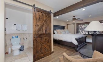 Master bedroom with King-size bed, ceiling fan, 50” SMART LED TV, and en-suite bath featuring travertine tile shower and premium fixtures