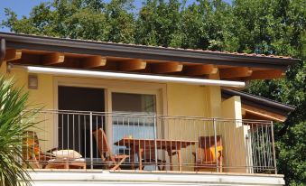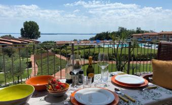 The living room has a beautiful terrace with garden furniture and sun blinds. From here you have a wonderful view of Lake Garda, Sirmione and the communal swimming pool of the resort. All rooms also have a balcony, the balcony of the master bedroom also overlooking the lake.