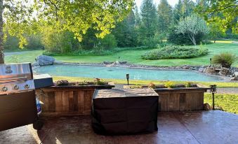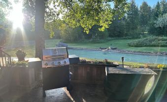 Revel in the seclusion of our scenic front yard and East Patio. There is plenty of open green space to throw a frisbee, kick a soccer ball, sunbathe, or read a book. The Byrd Bath (pond), is for aesthetic purposes only and not for bathing, wading, or swimming as its treated allowing the water to remain clear. We won't have any wood firepits on the property as tourist season in Montana can be very warm and dry and causes us to be in High Fire Danger for most of the summer; however we do have a gas firepit to sit around and make smores.