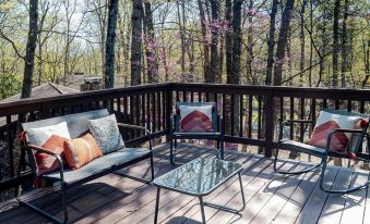 Sliding doors open to a spacious wraparound deck with plenty of seating, ideal for relaxing, dining outdoors, or simply taking in the peaceful natural surroundings