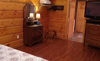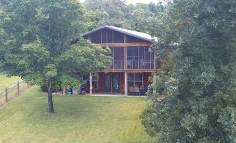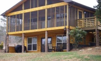 Rustic, well appointed cabin with 2000 sq ft, on the water. This place has everything you need to have a great, relaxing vacation or just a weekend getaway! Loaded with all the luxuries you require for your vacation stay. It has a living room and a den, both have LCD flat screen televisions and the downstairs den has a home theatre system. The upstairs is where you will find 2 of the 3 bedrooms and 1 of the full baths. The brand new kitchen has everything you need and more. The kitchen is combined with the dining area and living room to become one large great room. Master suite is located downstairs with en suite bathroom. Also located downstairs in the den is a beautiful stone gas fireplace and a great card table for your enjoyment. Both levels have all windows facing the water so you can enjoy the reason you came. The great walk-out floorplan allows you to walk out on large upstairs screened porch, while the downstairs puts you out onto the completely covered grilling and dining area.