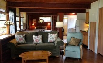 Yet, there's more to discover. Slide through the double doors at the living room's base, stepping into your private screened porch. Nestle into one of the two comfortable wooden chairs and soak in the panoramic views of lush greenery and nature. It's an ideal spot for a quiet morning coffee, shared with your loved one, as the indoor and outdoor worlds blend seamlessly in a symphony of comfort and natural beauty.