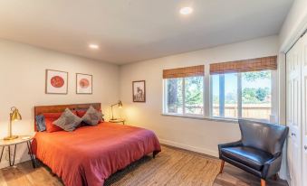 Larkin Meadow House is a spacious and comfortable home situated on almost two acres of private land and conveniently located less than a mile away from Mendocino Village. The downstairs features three bedrooms, one and a half baths, an updated kitchen, and electric fireplace. The upstairs is a separate studio with private deck (with a partial ocean view), king sized bed, bathroom and kitchenette. Cozy modern furnishings throughout.About pets:No pets allowed.About checkOut:Check out before 11:00 AM.About children:Children allowed: ages 0-17.About checkIn:Check in after 3:00 PM.About smoking:Smoking is not permitted.About minBookingAge:Minimum age to rent: 21.About events:No events allowed.