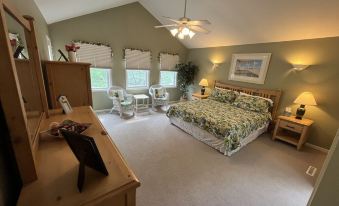 The Pineapple Retreat has a master bedroom, king-size bed, adjoining bath, and private balcony. The second bedroom has a queen-size bed with adjoining bath. The third bedroom has two sets of bunk beds, and the fourth bedroom has bunk beds with a full bottom and twin top. The first floor has a living room with a massive sectional and full size futon, dining room seating for four, island seating for five, kitchen table seating for six, and table on screened-in porch which seats four. We have provided for all your needs by including a hair dryer in each bathroom, a high chair, a stroller, picnic basket, army beach blanket, and beach chairs.