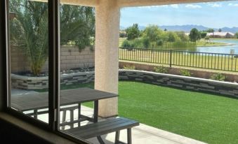 The back yard with grill, sitting areas, and gated pool and spa that will melt your stress away!!
