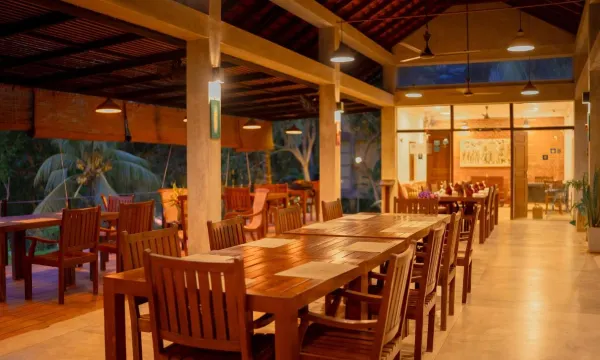 A nice little place tucked down a dirt track. Right on the river. The rooms are spacious and clean, the staff are very helpful and the surroundings are beautiful. The bathrooms are are open roofed which sounds lovely but are pretty much a breeding ground for mosquitoes and there are no nets around the beds. Also makes it very easy for bugs, spiders and insects to get in. So in the mornings it’s always a bit of a gamble of what will be waiting for you! We ate once at the restaurant but it wasn’t good. Pretty sure it was uncle bens rice, so we went onto the main ***** and ate at the onion cafe which was amazing!