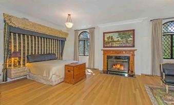 The master bedroom is on the first level, with a hand carved bird eye maple fireplace and is approximately 600 square feet.