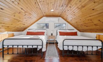 This two-story cabin has two comfortable bedrooms, each carefully designed to make you feel relaxed during your vacation. On the top floor in the loft, you’ll find two full beds with forest views.