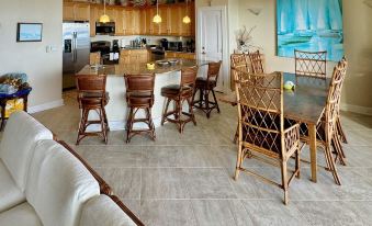 Stepping outside onto the private covered patio, you will immediately feel the ocean breeze. Choose to lounge on the plush patio furniture or one of the lounge chairs by the infinity edge pool and hot tub. Or, step off the patio onto the soft, white sand just feet away from the ocean waves. The beautiful beach extends 8 miles to the left and 2 miles to the right.