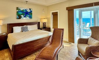 The second upstairs bedroom boasts its own smaller balcony that sits nestled among the palms and foliage overlooking the grounds. There is a pedestal jetted tub with a hand-held shower wand in the cheerfully decorated bathroom. In addition to the TV, there is a separate writing desk, a perfect spot to unwind after an active, sun-filled, adventurous day.