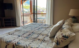 The spacious upstairs Master Bedroom features a private balcony with breathtaking mountain views. A king bed and two full closets and a large dresser give you plenty of storage for a longer stay. A flat screen TV with cable completes a wonderful master bedroom suite.