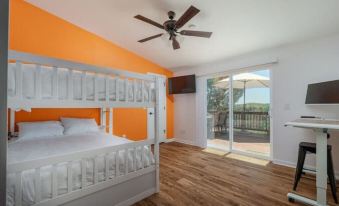 Orange Bedroom: 2 Twin Beds, 1 Single Bed pull out underneath, office space with electric portable stand-up desk, computer monitor, 42 inch SmartTV, sliding door out to back patio with valley view. In the closet are extra chairs, fans, yoga mats, frisbees, extra pillows/sheets/blankets, and a foldable crib.