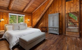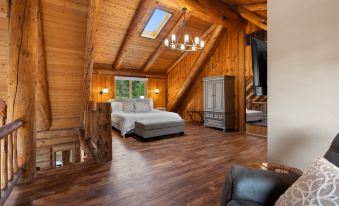 The Riverside Retreat sleeps up to 6 guests with two bedrooms, each with a king and a pull out queen sleeper sofa in the great room. The primary bedroom upstairs offers one with a king bed and a children’s nook with games and activities. There is a king bed in the downstairs bedroom.