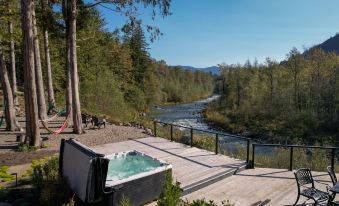 Prepare a special dinner in the newly-remodeled, fully-equipped kitchen. Gather your group and sit around the propane fire pit or take a soak in the river facing hot tub with the roaring sounds of the Sandy River. There is a quick hike down to the Sandy River for river access for fly fishing and exploring.