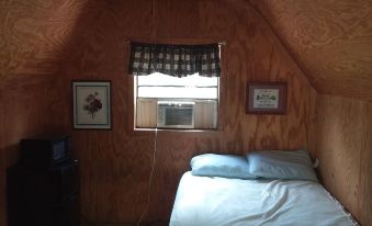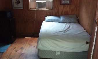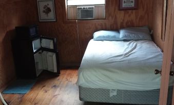 One rustic cabin. Is a single room with one full size bed. Microwave and fridge. Also has heat and air. No bathroom or kitchen. You must provide your own bed linen. Showers and bathrooms are on campground location.