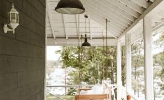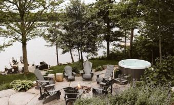 The Farmhouse has beautiful south-facing panoramic views of Gaunt Bay on the Moon River. The interior of this historic property has been transformed into a modern farmhouse cottage retreat. The property has beautiful granite steps that lead you down to the first level with a fire pit and a hot tub overlooking the bay, then continue down to the spacious dock perfect for entertaining friends and family. Lots of green space for games.